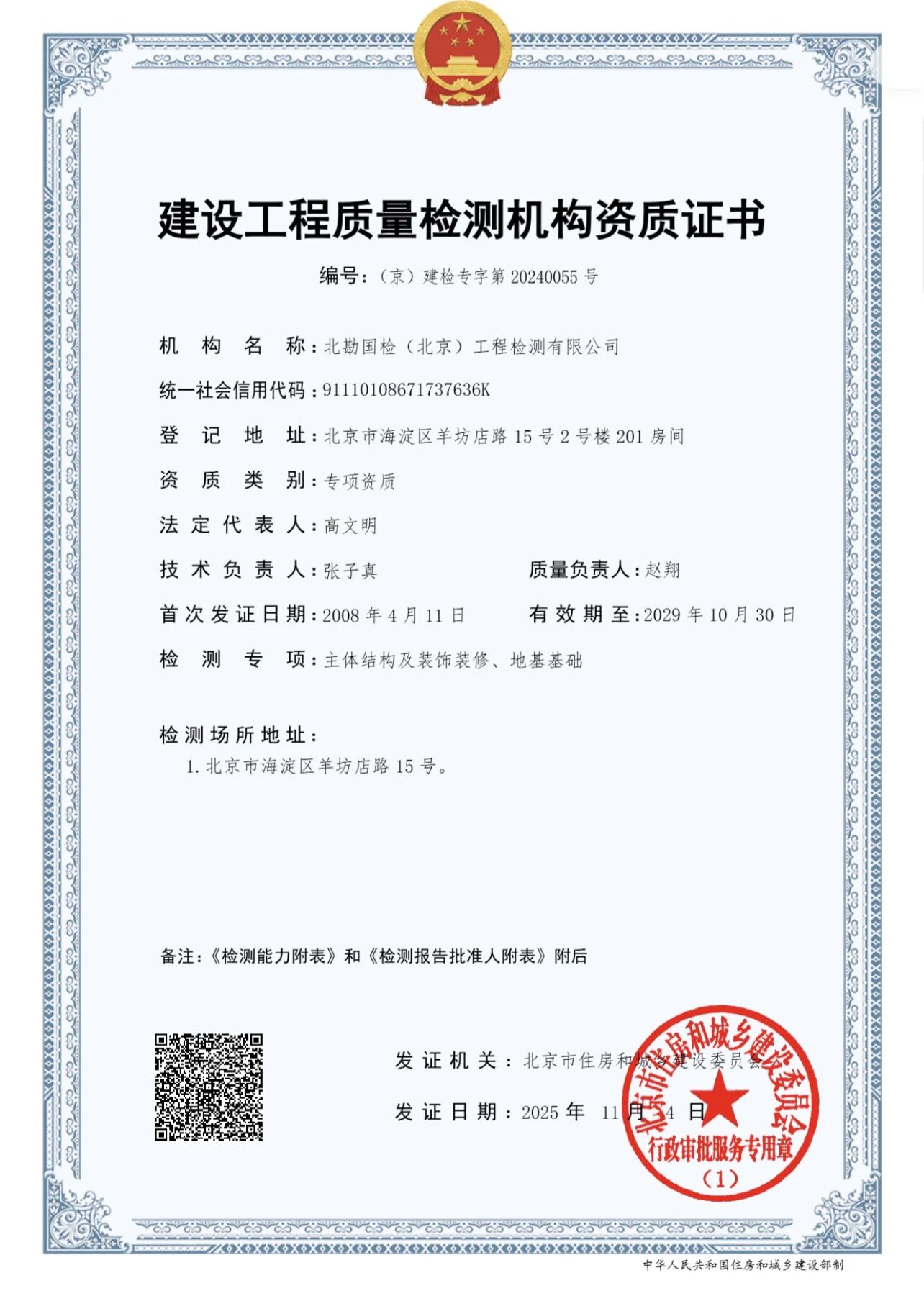 北勘國檢喜獲主體結(jié)構(gòu)及裝飾裝修專項檢測資質(zhì)