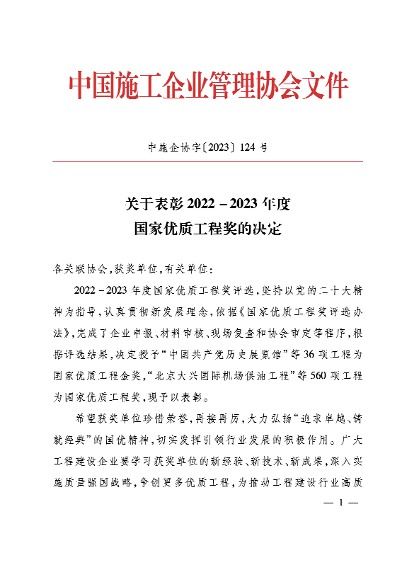 日前,中國(guó)施工企業(yè)管理協(xié)會(huì)公布2022-2023年度國(guó)家優(yōu)質(zhì)工程獎(jiǎng)獲獎(jiǎng)名單,北勘院作為勘察單位完成的中國(guó)共產(chǎn)黨歷史展覽館、北京環(huán)球影城主題公園(一期)、中信大廈、國(guó)家速滑館4項(xiàng)重大工程榮獲國(guó)家優(yōu)質(zhì)工程金獎(jiǎng),北京大興國(guó)際機(jī)場(chǎng)供油工程、延崇高速公路(北京段)等8項(xiàng)工程榮獲國(guó)家優(yōu)質(zhì)工程獎(jiǎng)。