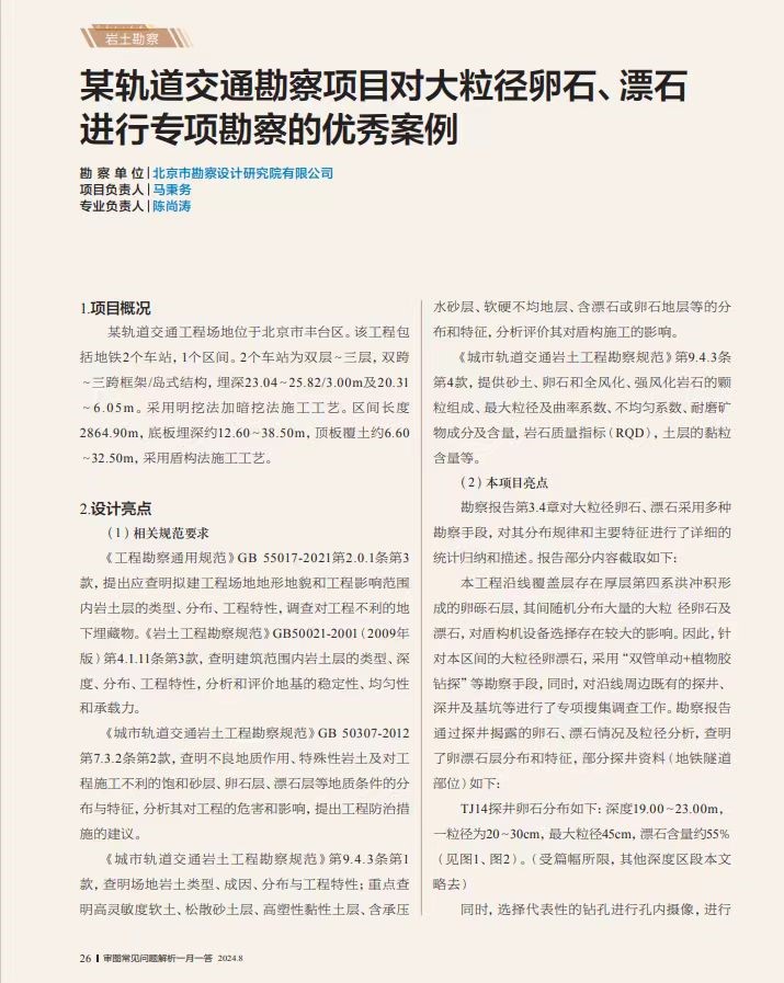 專家點評如下:本工程通過多種勘察手段(植物膠鉆探、井探、物探、井下電視、室內(nèi)試驗等)查明對軌道交通實施影響范圍內(nèi)的卵石、漂石分布特征及物理特性,分析了卵石、漂石對軌道交通工程的危害和影響,提出了具有針對性的工程防治措施,給設(shè)計、施工提供了詳實的基礎(chǔ)資料,為軌道交通工程的順利建設(shè)提供了堅實的基礎(chǔ)。值得學(xué)習(xí)借鑒。