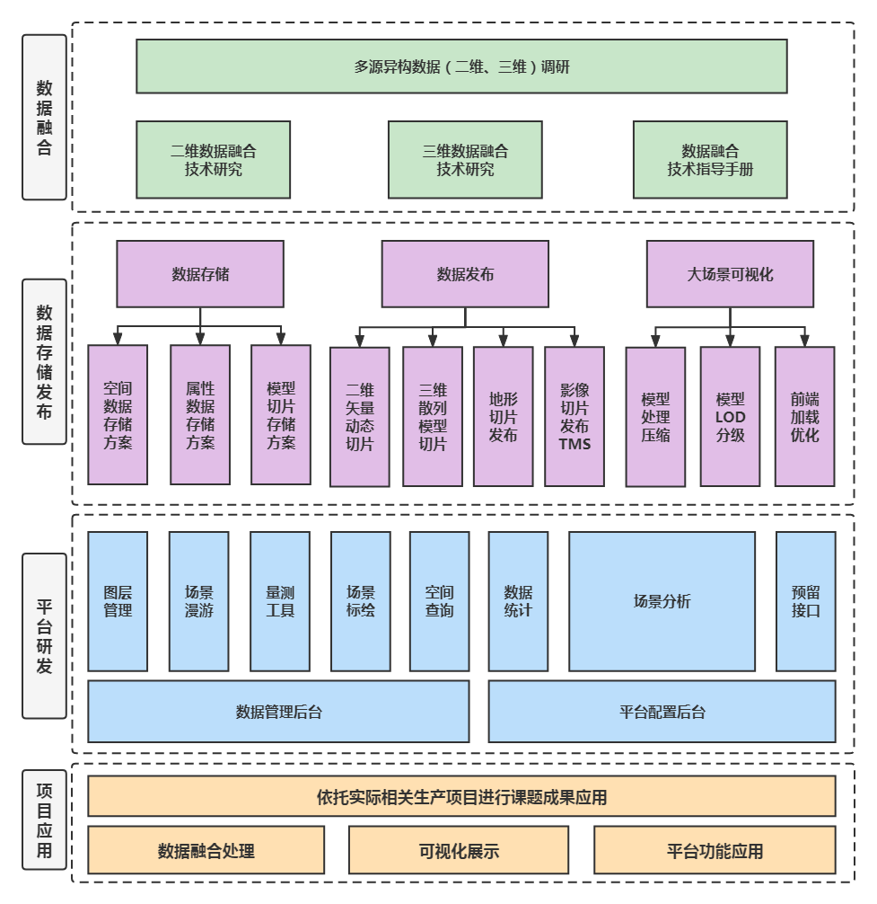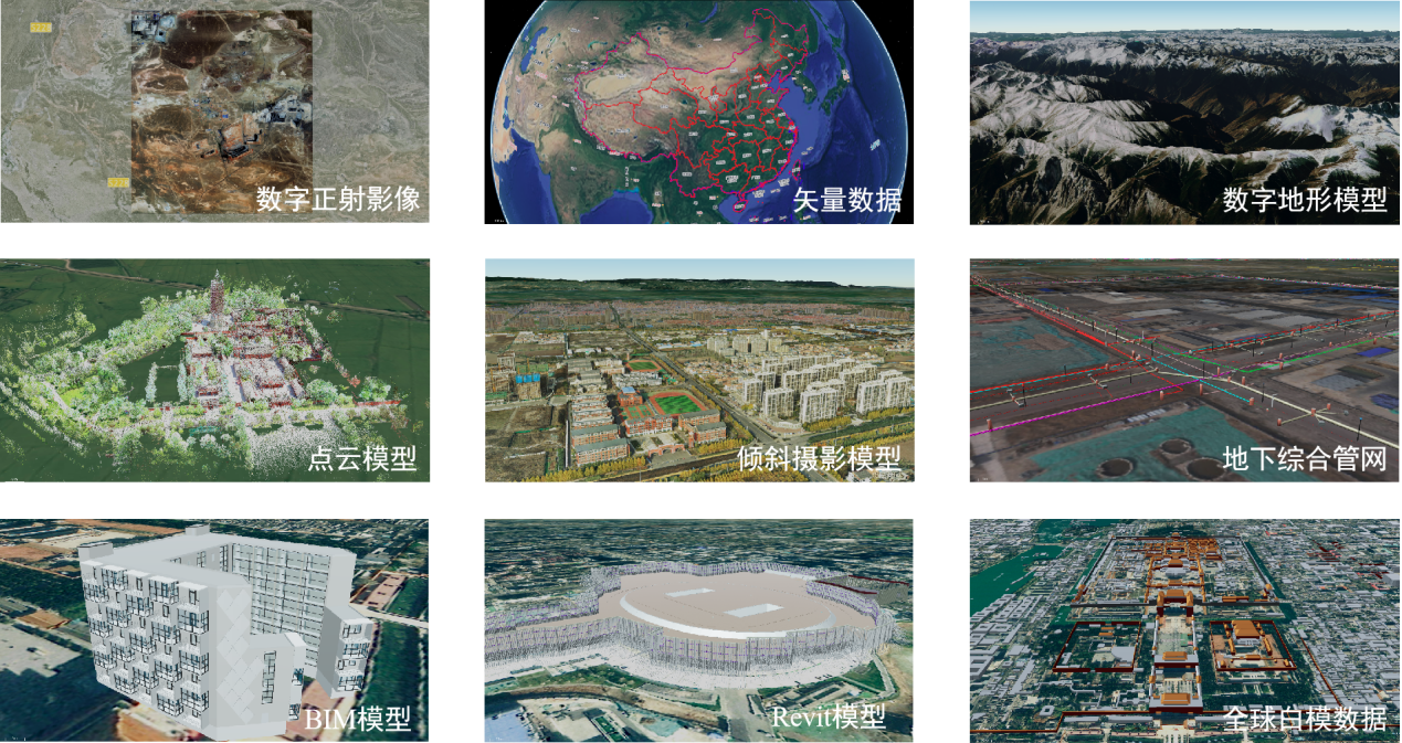 基于通用GIS數(shù)據(jù)(遙感影像、數(shù)字地形模型、傾斜攝影模型、點(diǎn)云及BIM模型等),通過數(shù)據(jù)切片算法,研究三維原始數(shù)據(jù)向場景數(shù)據(jù)轉(zhuǎn)換技術(shù)方案,基于坐標(biāo)參考、數(shù)據(jù)格式、屬性掛接、紋理壓縮及模型輕量化,實(shí)現(xiàn)多源異構(gòu)二三維數(shù)據(jù)融合。
