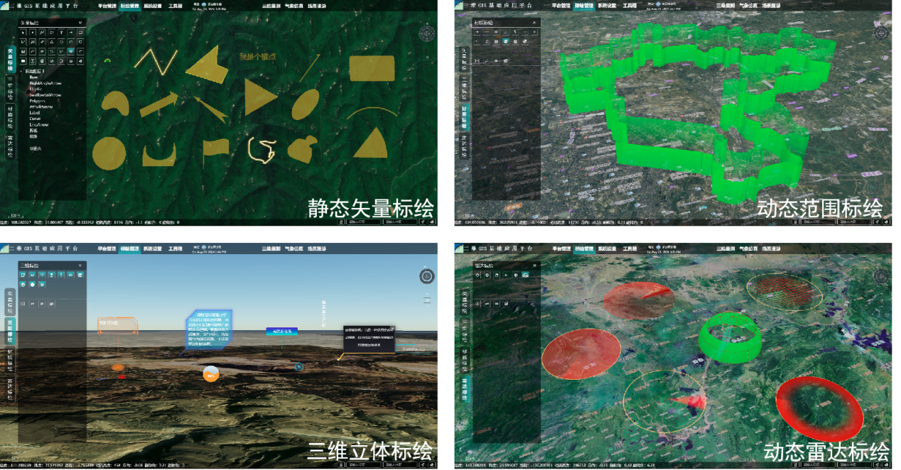 平臺內(nèi)置靜態(tài)矢量、動(dòng)態(tài)范圍、三維立體、動(dòng)態(tài)雷達(dá)四類標(biāo)繪模塊,研發(fā)50余種二三維地理要素標(biāo)繪,實(shí)現(xiàn)標(biāo)繪要素空間與屬性信息入庫,滿足多方面的場景要素標(biāo)繪需求,助力構(gòu)建豐富的三維場景地理信息要素。