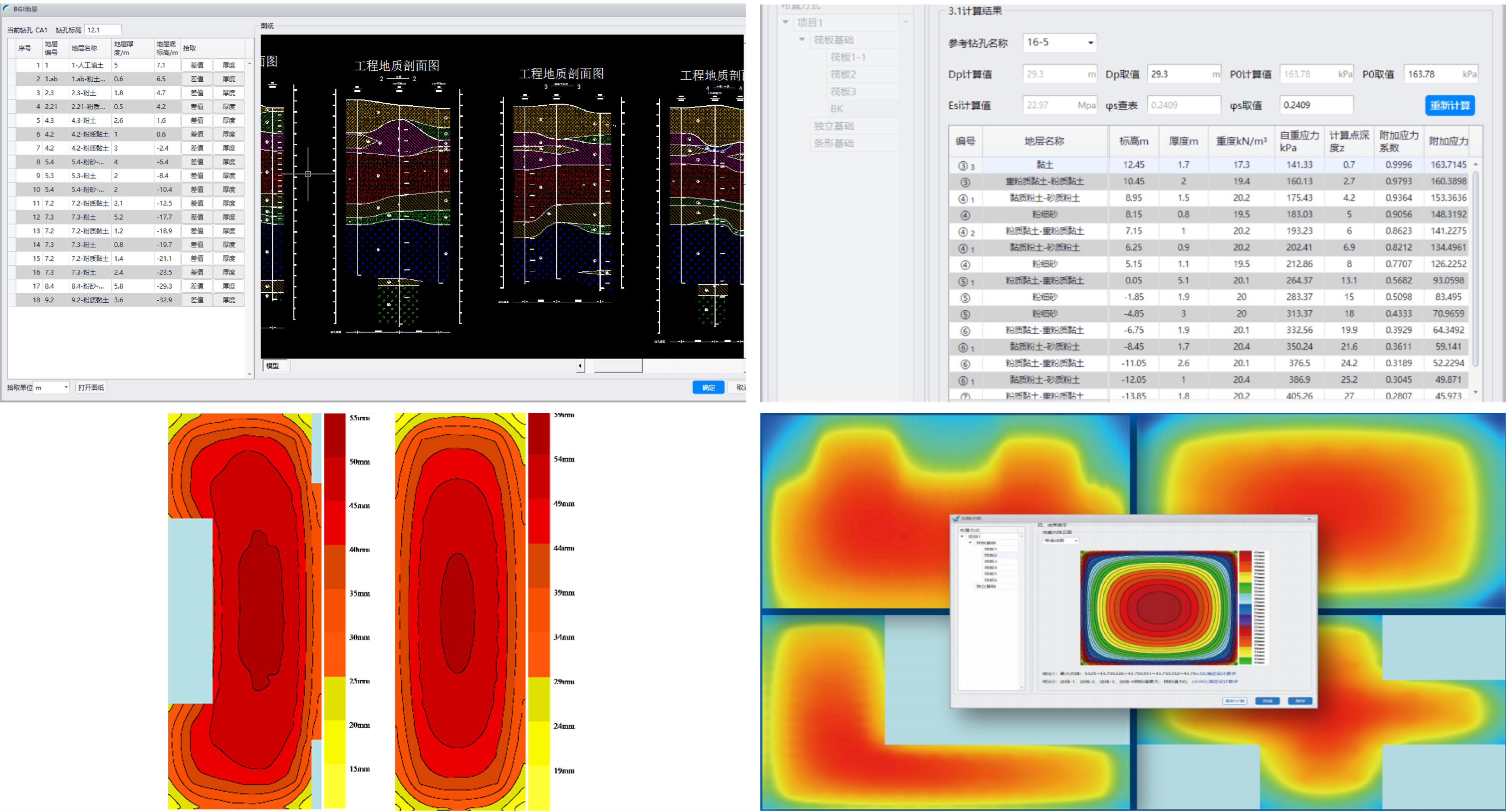 通過優(yōu)化建筑基礎沉降算法,實現基礎內任意點位的沉降計算、不規(guī)則基礎輪廓的計算以及自動傾斜的計算。創(chuàng)新性實現基礎底面全域沉降計算,極大提升了計算分析的精準度和高效性,大幅簡化復雜的沉降計算流程。通過云圖、等值線圖等展示方式,使計算成果變得更加豐富和直觀,為設計決策提供更加堅實可靠的計算依據。