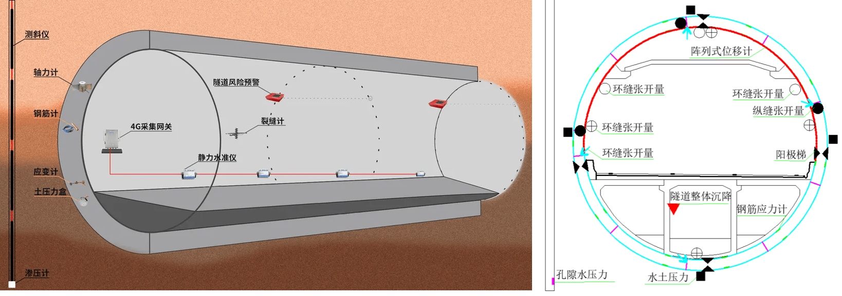 北勘監(jiān)測團隊負責(zé)人介紹,本項目為超大直徑、超深埋深的盾構(gòu)長距離穿越富水軟弱地層,先后穿越55處重大風(fēng)險源,安全風(fēng)險管控難度極高。北勘院針對工程實施特點,預(yù)先在隧道內(nèi)“穿戴”了1300余個結(jié)構(gòu)變形位移、荷載內(nèi)力及結(jié)構(gòu)耐久性等自動化監(jiān)測傳感器,包括北勘院自主研發(fā)的陣列式位移計、壓差式靜力水準儀及自組網(wǎng)網(wǎng)關(guān)和節(jié)點硬件設(shè)備等,實現(xiàn)了對結(jié)構(gòu)變形、受力、鋼筋腐蝕等隧道健康關(guān)鍵信息的實時、高效、智慧感知,保障了高風(fēng)險環(huán)境條件下隧道的安全。