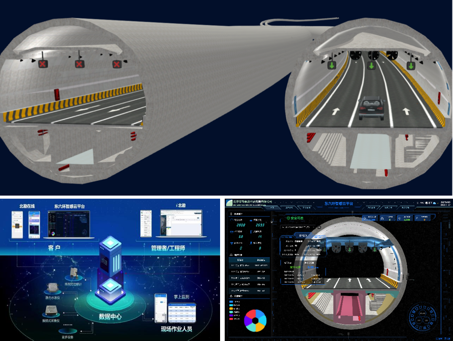 隧道通車運營后,智慧監(jiān)測的理念將貫穿始終。北勘院針對隧道長期運維特點,充分發(fā)揮自身科技創(chuàng)新優(yōu)勢,以“i北勘”項目管理系統(tǒng)為數(shù)據(jù)底座,融合“掌上監(jiān)測”、“北勘在線”等量測監(jiān)控系統(tǒng),構(gòu)建了動態(tài)、智慧、多通道的“東六環(huán)隧道健康智慧管理平臺”,利用平臺化全自動的數(shù)據(jù)采集及先進的傳輸、處理、分析技術(shù)和孿生的隧道狀態(tài)三維模型漫游表達,實現(xiàn)隧道全生命周期的智能化健康管理。
