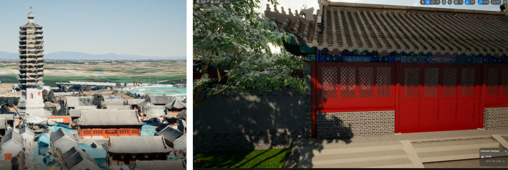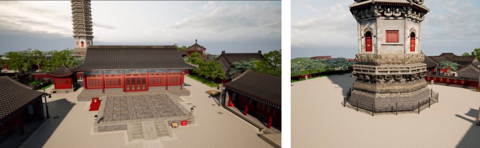在場(chǎng)景渲染領(lǐng)域,充分利用虛幻引擎的高真實(shí)感與交互性優(yōu)勢(shì),通過(guò)精細(xì)光照、PBR材質(zhì)渲染及Lumen技術(shù),實(shí)現(xiàn)古建筑模型的高保真呈現(xiàn)。色彩、光澤、質(zhì)感均與實(shí)物無(wú)異,為游客營(yíng)造出身臨其境的沉浸式體驗(yàn)。