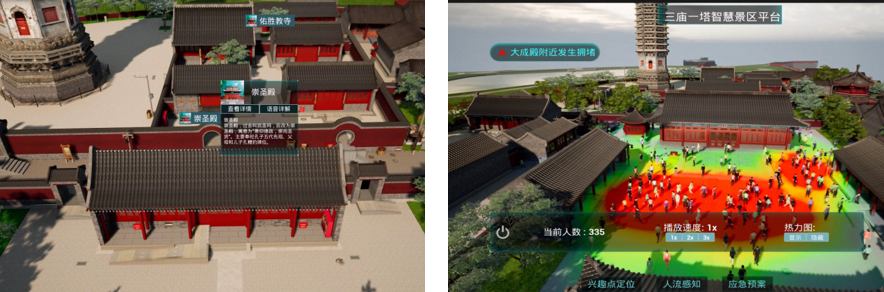 研發(fā)的三維可視化平臺(tái)集三維瀏覽、興趣點(diǎn)定位、模擬仿真于一體,游客可自由探索虛擬場(chǎng)景,深入了解古建筑背后的歷史故事。同時(shí),平臺(tái)賦能景區(qū)管理,實(shí)現(xiàn)二維預(yù)案的數(shù)字化升級(jí),助力實(shí)時(shí)規(guī)劃路線與精準(zhǔn)決策。